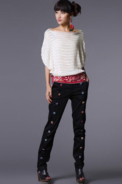 套头薄针织,微透的面料能隐约看到身姿,但因为宽松,看到的只是一个模糊的、偏瘦的轮廓。下摆的彩色插针绣很精致,配一件纯白蝙蝠袖上衣,手臂和腰上的肉肉都被忽略了。
