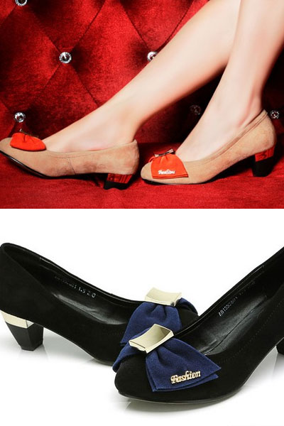 黑色单鞋低调,加上水钻蝴蝶结就有了华丽感。蝴蝶结够大、够醒目,配上同样有分量的粗高跟,就算小腿偏粗也能穿出细长效果。