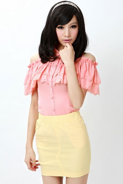 甜甜的、俏俏的,异性看了有好感,长辈看了也不觉得过分。这件衬衫在肩膀做了斗篷式荷叶边,只露一点点肩,像小鸟依人,又有点小公主的华美。